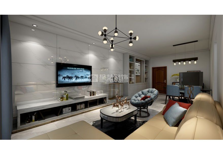 業(yè)主香港人,老婆和小孩長期居住不香港,只有他本人居住,對空間的要求設(shè)計(jì)是簡介干凈,保留原格局不要改動,預(yù)留給家人偶爾過來可以居住??臻g設(shè)計(jì)主打以白色為主,保證空間的通透一體,不需要雜亂的屏風(fēng)隔斷,入戶進(jìn)來一個(gè)淺白原木色調(diào)的鞋柜端景,簡單的柜門線條勾勒,以實(shí)用和美觀結(jié)合為一體,配合一副藝術(shù)的裝飾畫,讓空間多了一絲品味,電視背景墻用的是潔白而不失質(zhì)感的的大理石,連接著與電視柜為整體造型來貫穿和鞋柜的呼應(yīng)。三個(gè)筒燈的設(shè)計(jì)讓背景墻多一絲的氛圍感,地面采用600*1200的大磚來鋪設(shè),黃色的的皮質(zhì)沙發(fā)和個(gè)性的茶幾,搭配一個(gè)藍(lán)色懶人椅,配合遠(yuǎn)處的淡藍(lán)色布藝窗簾,讓空間簡單而不簡約,簡約而不失內(nèi)涵