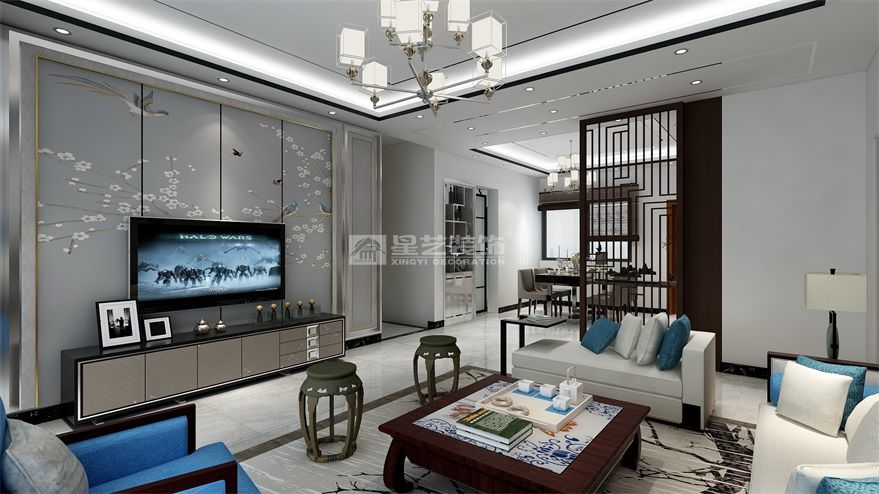 客廳采用的現(xiàn)代中式沙發(fā)和具有韻味的電視背景,整體空間一黑白為主色調(diào),輔之以藍(lán)色,紅木色和少量的黃色,簡(jiǎn)約而不失品味,電視強(qiáng)墻硬包的采用,景中有雀鳥和桃花的綻放,望著鳥兒徘徊,彷佛聞到了花香,心底對(duì)自然的熱愛在這一刻被掀起,久久不能平靜。