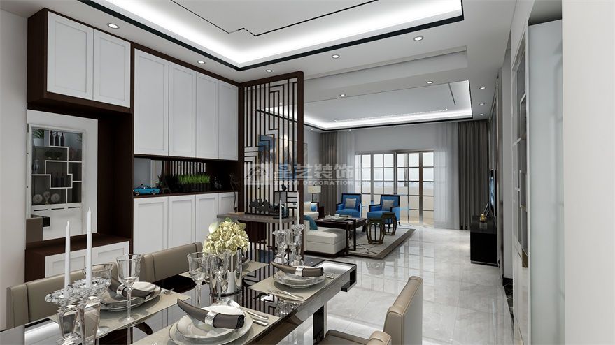 業(yè)主夫妻是退休的老師,對(duì)中式的古典和現(xiàn)代的美學(xué)有著濃厚興趣,家庭居住房屋的居住老兩口,還有他們的女兒和一個(gè)小外孫女。在原格局的基礎(chǔ)上沒有進(jìn)行改動(dòng)。整體用現(xiàn)代的表現(xiàn)手法和添加中式元素進(jìn)行設(shè)計(jì),客餐廳運(yùn)用的一個(gè)通透古典屏風(fēng)來進(jìn)行客餐廳劃分,餐廳區(qū)域以現(xiàn)代為主,回型的天花造型和黑色線條進(jìn)行勾勒點(diǎn)綴,配合著長(zhǎng)方的現(xiàn)代餐桌,墻面采用乳白的是色調(diào)和廚房的移門跟旁邊的鞋柜門板形成一體。