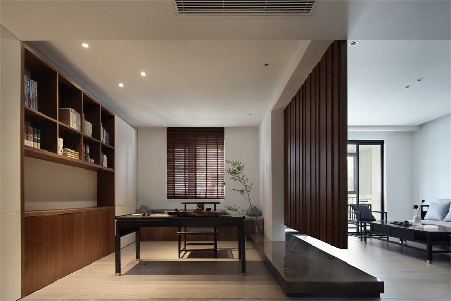 餐廳深色量體是空間中的主體,柜體造形的延伸、交迭以及墻面適度的留白,均凝聚著空間的形與神,靜謐的空間里流淌著濃濃的文化馨香與藝術(shù)氛圍,整個(gè)空間清晰明亮素雅。