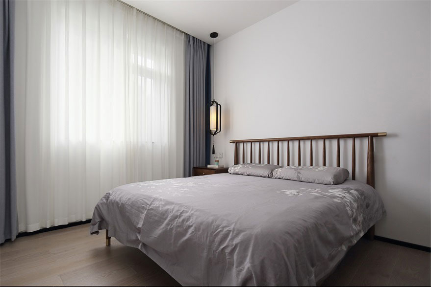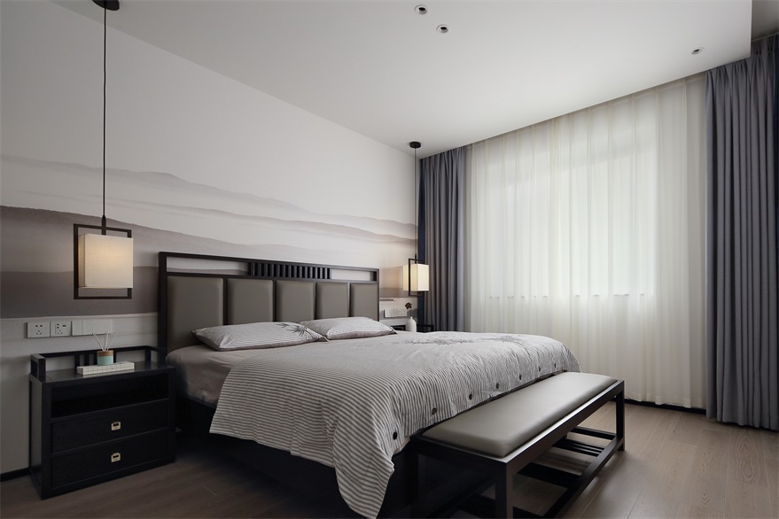臥房空間清晰明亮素雅,萃取一抹山水作為視覺符號,浸透著東方特有的禪思靜謐。