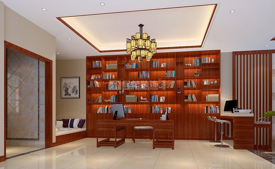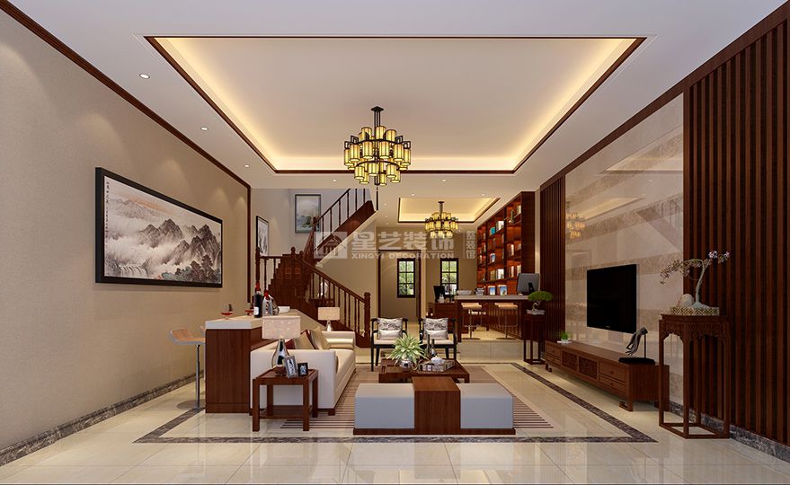 客廳是躍層式的空間,廚房及餐廳當初設計的時候是放在負一層,書房放在一樓與客廳在同一個空間,客廳與書房間隔處設計了一個書吧,平??梢栽跁缮仙暇W(wǎng),俯視整個客廳;沙發(fā)背后設計了一個吧臺,在風水學上來說是“靠山”,那業(yè)主的喜好是邊品酒,邊看電視。