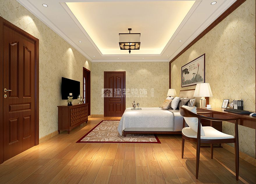 背景墻采用簡潔的木線條包一個背景框,整體采用暖黃色系的墻漆,地板與墻漆的顏色相互呼應,使空間更溫馨。